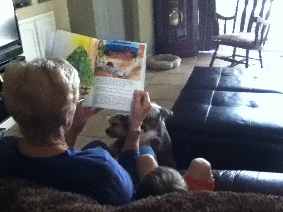 Friend, Red Hatter and Safe House volunteer, Lois Balsis reads Magical Shoes of Santa's Elves to her grandson. Getting ready for Santa! October, 2011.
